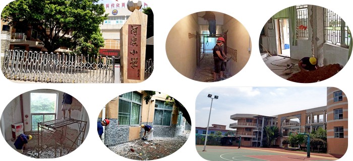 河滨小学教学楼抗震加固工程为我司中标项目,位于东莞市寮步镇,包含ABCD栋四栋建筑,均为钢筋混凝土框架结构。工期为48天,我司于7月10日顺利进程施工,该项目属于公共设施建筑,因此工地的安全、文明、设备围护等工作尤为重要并且涉及工序较多且很多相互交叉,且施工工种较多,如:混凝土结构以及钢构件的拆除(柱加固、梁加固、板加固等工种);并需在暑假结束前顺利完工,工期十分紧,但在我司领导以及周密的施工计划安排已顺利完工!