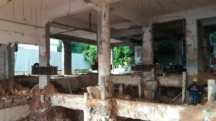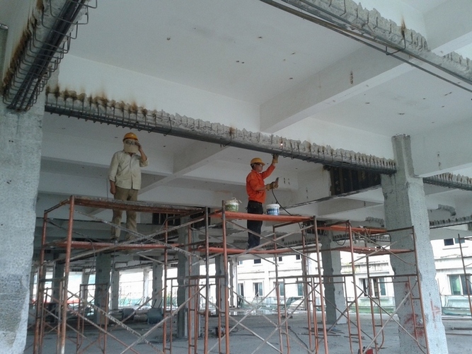 5、对通长、贯通的危险结构裂缝,裂缝宽度大于0.2mm的处理方法也为:除了沿缝凿成V字形凹槽冲洗干净,将环氧树脂液用压力灌入缝内封闭外,还要用粘扁钢或碳纤维布等措施对楼板进行加固。