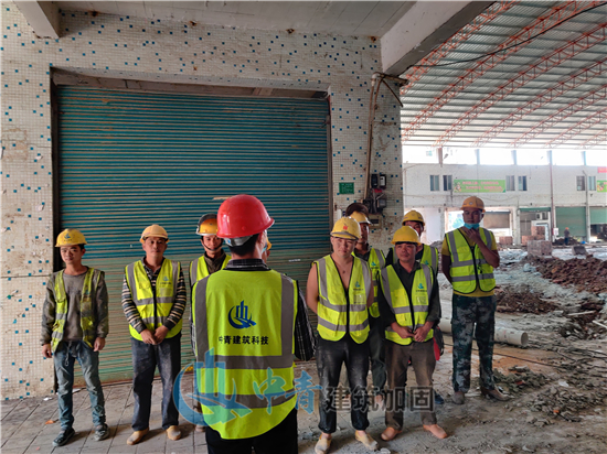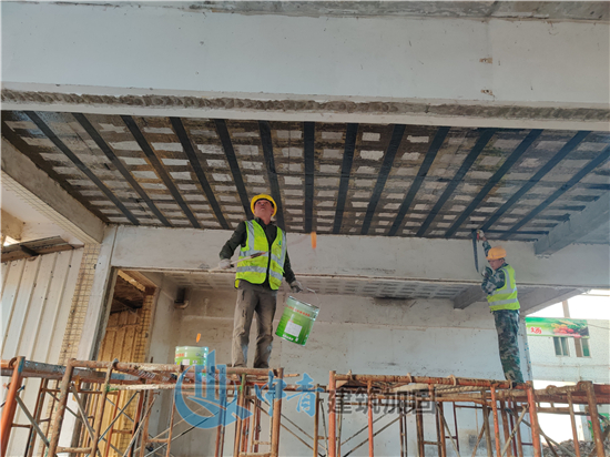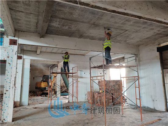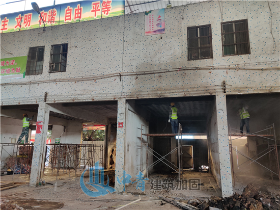 三江农贸市场原建筑为2层房屋,1层为农贸市场及商铺,2层为住人宿舍,层高约3米。主要加固施工为二层板底(即一层商铺顶面)贴碳布;二层部分房屋柱包钢(20根柱)。