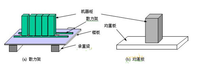 设备机房间增加钢架平台,支撑点设置在梁上。将机房设备放置在钢平台上,从而减轻地板的载荷已达到扩大机房承重目的,楼顶设备及房间常用。